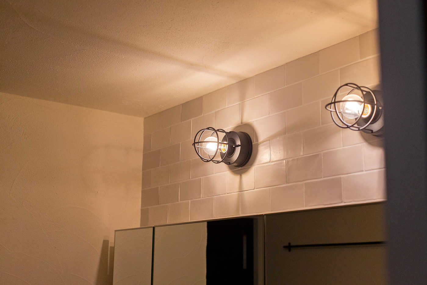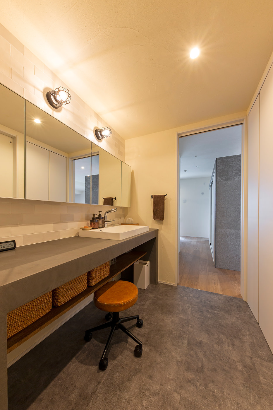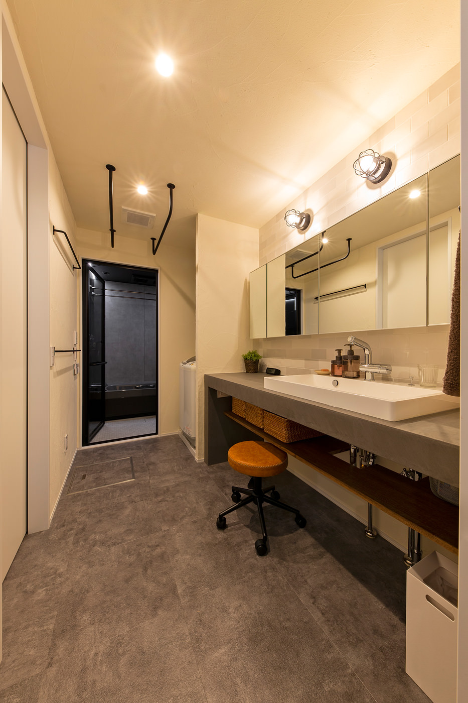 モルタル風のカウンターに上置き式の洗面ボウル、風合いのあるタイルの床やマリンランプでスタイリッシュな空間に。