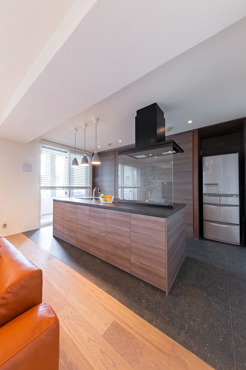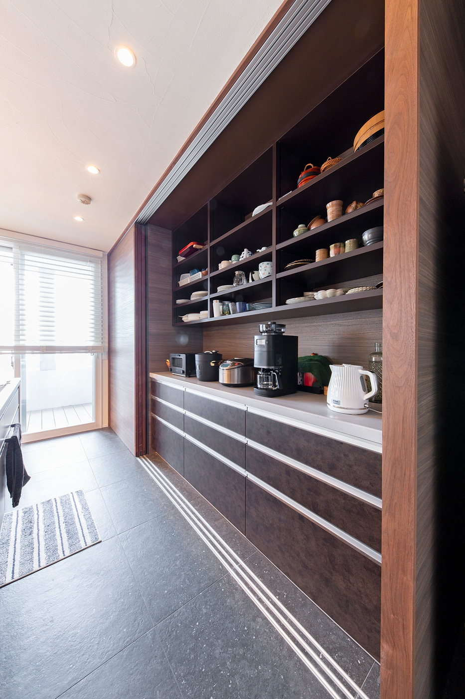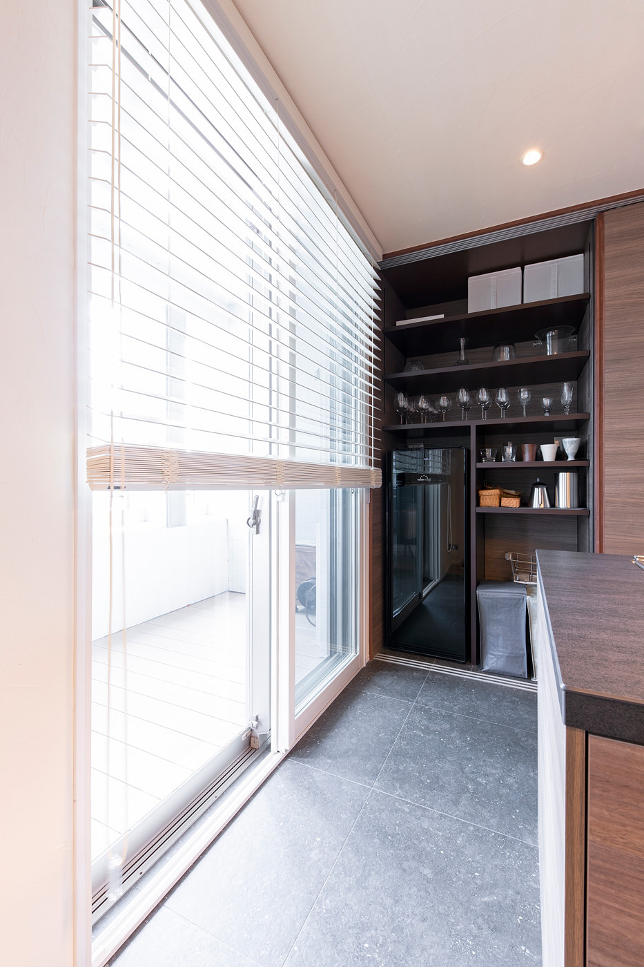 中の壁面にも同じ壁化粧板を貼っており、家電製品もデザインを吟味しているので、引き戸を開けていても洗練された印象