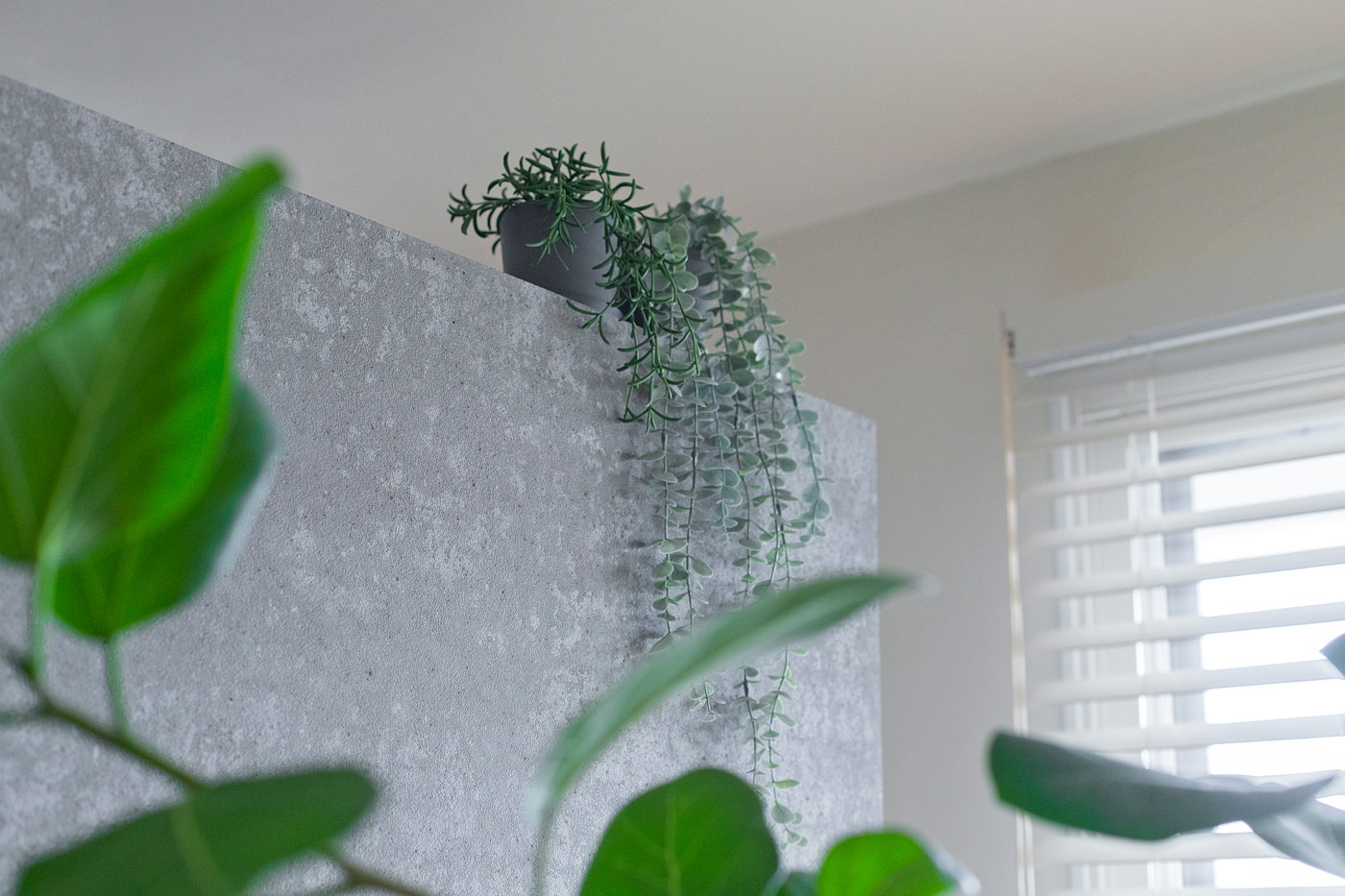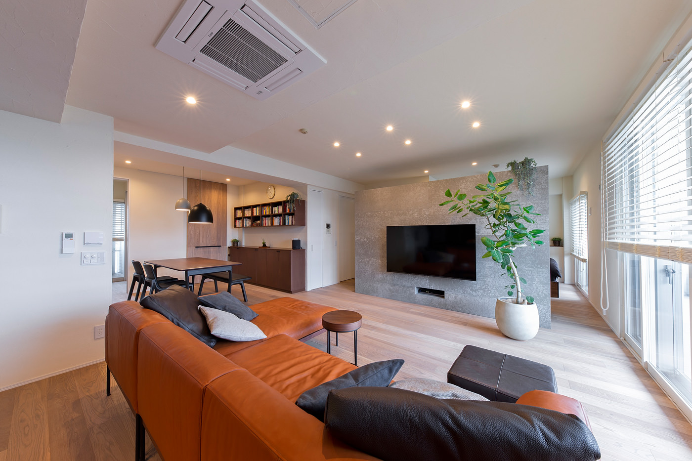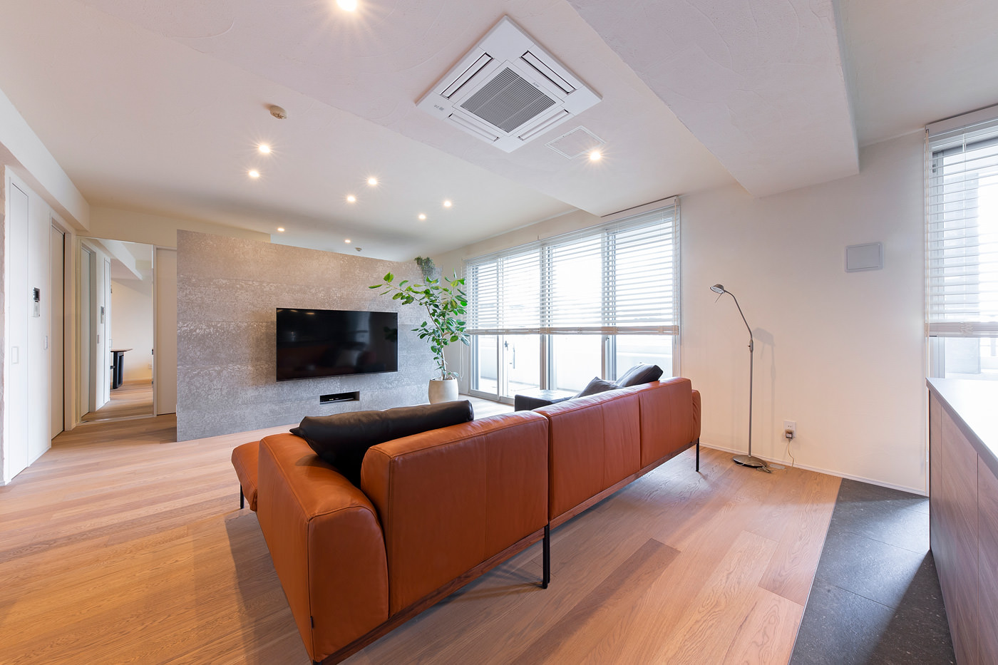 TVを設置した壁は、セメントが主原料の風合いのある素材。寝室との間仕切りを兼ね、さらに裏側は収納に活用。