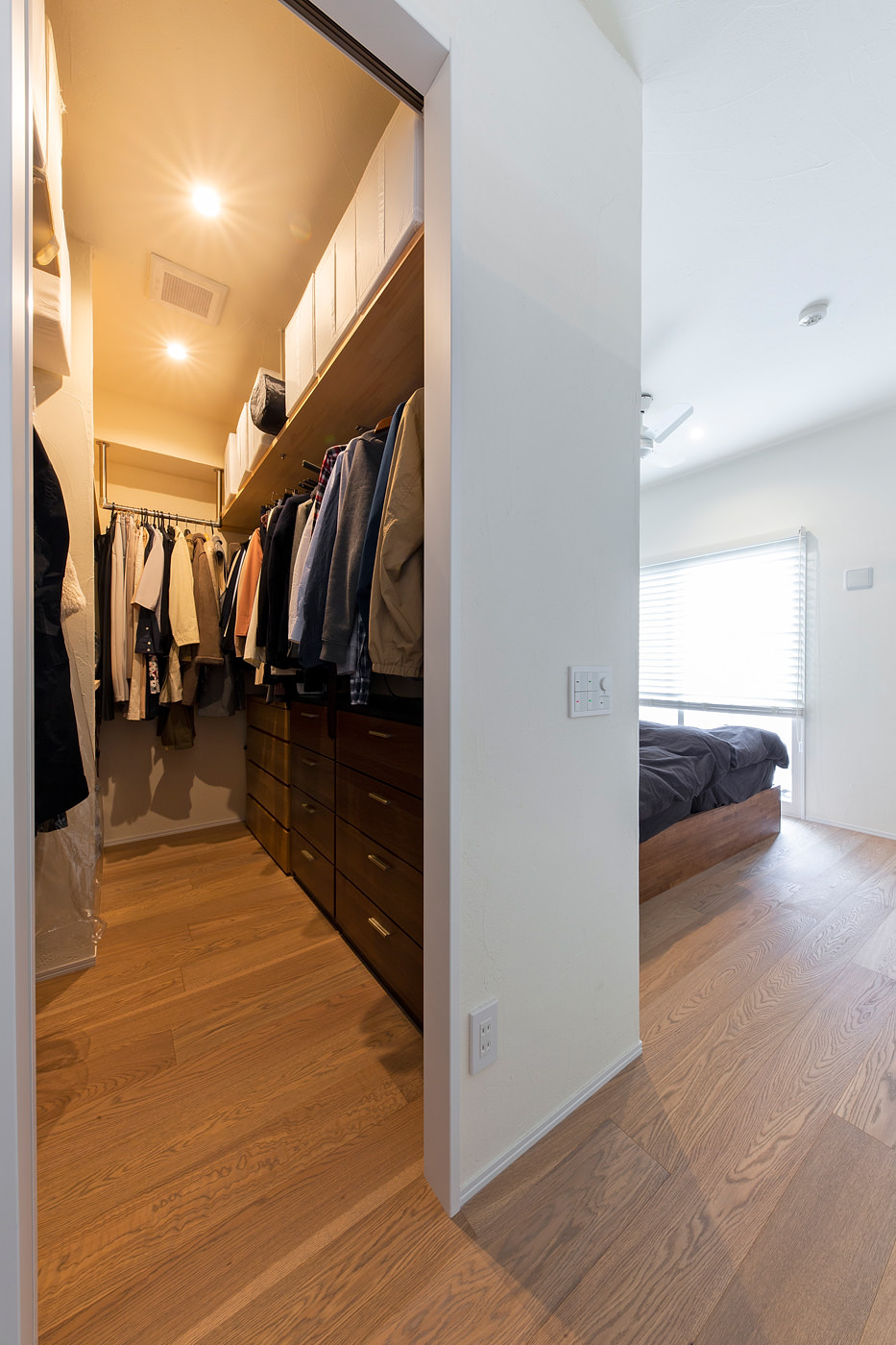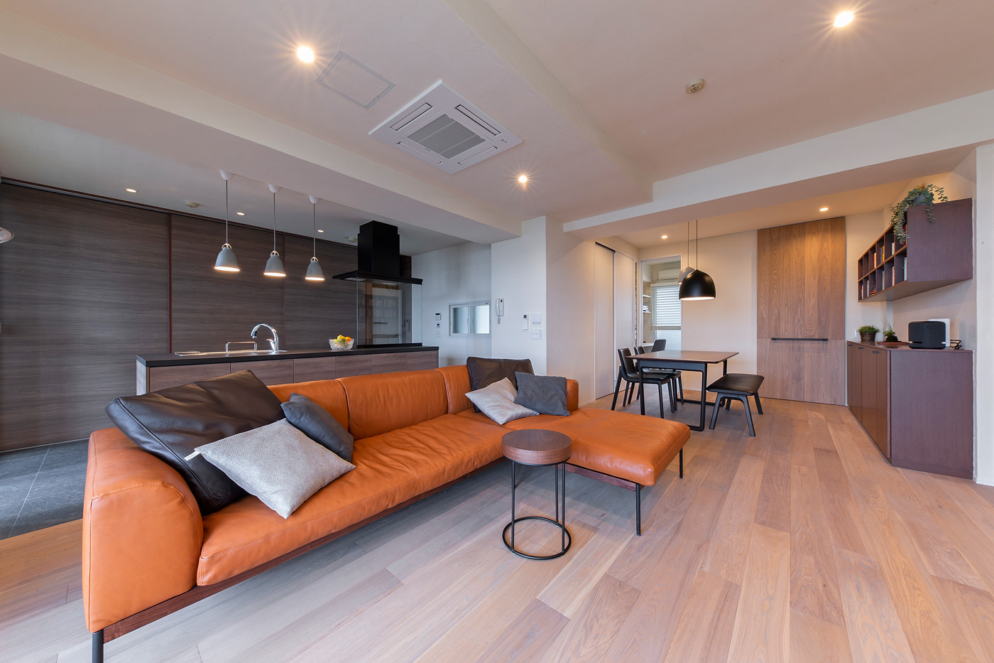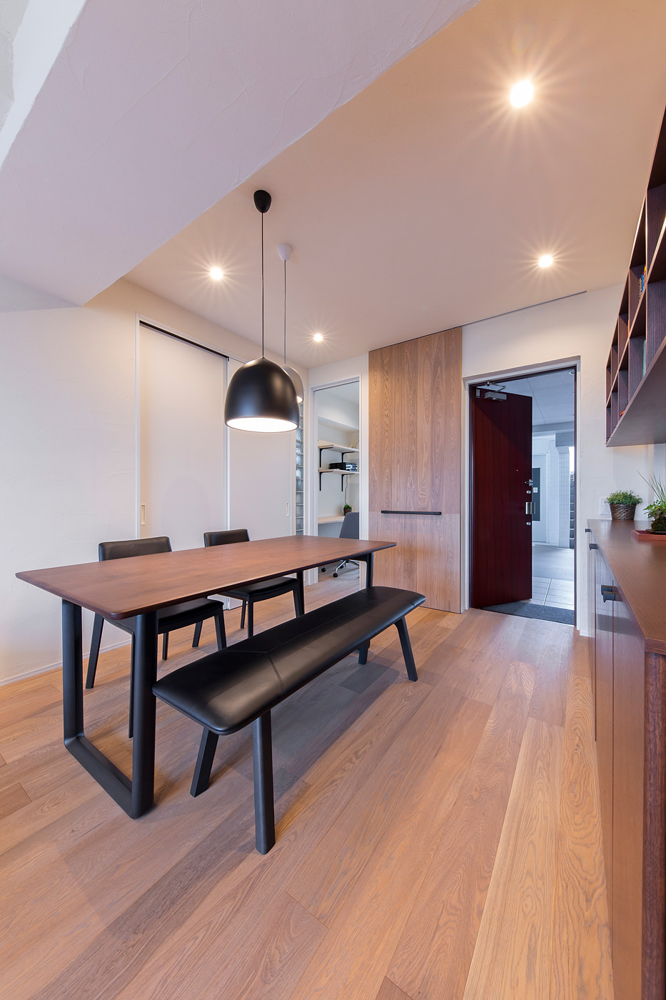 玄関ホールをなくし、いきなりLDKに入るプランに。玄関ドアの前には床と同じ材で造作した引き戸を設け、見た目の違和感をなくした。