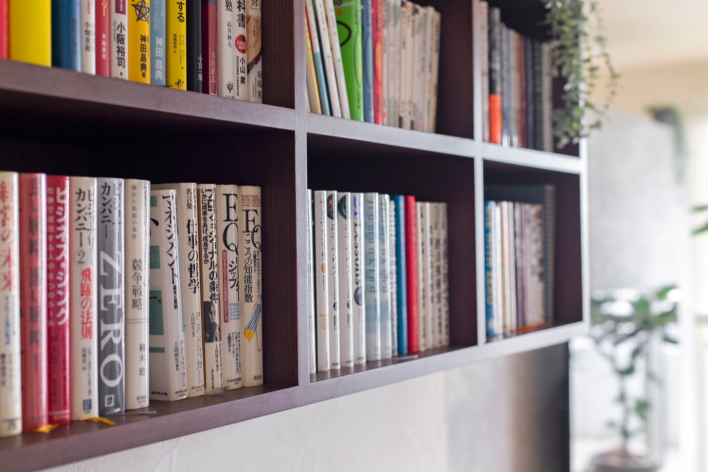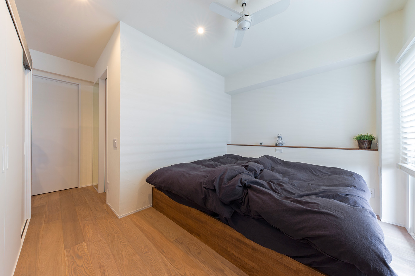 コンパクトな空間だがデスクと棚、背面には収納を造り付けて機能的に。