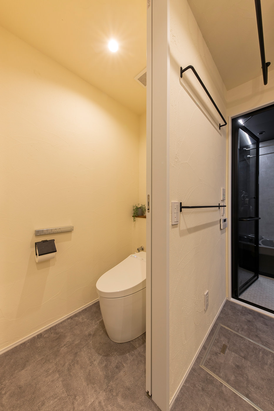 天井には室内干し用のアイアンバーを設置した。バスルームもグレーを基調にし、扉を透明に。