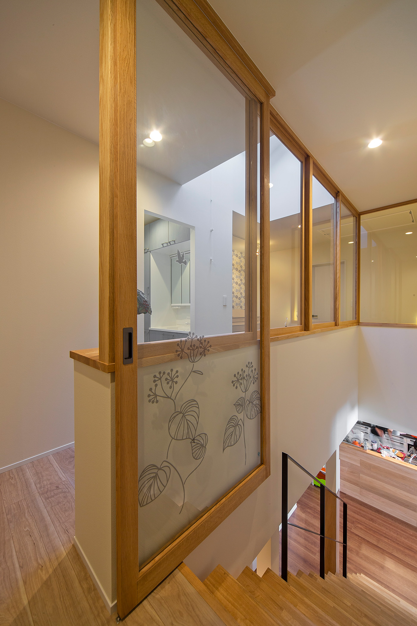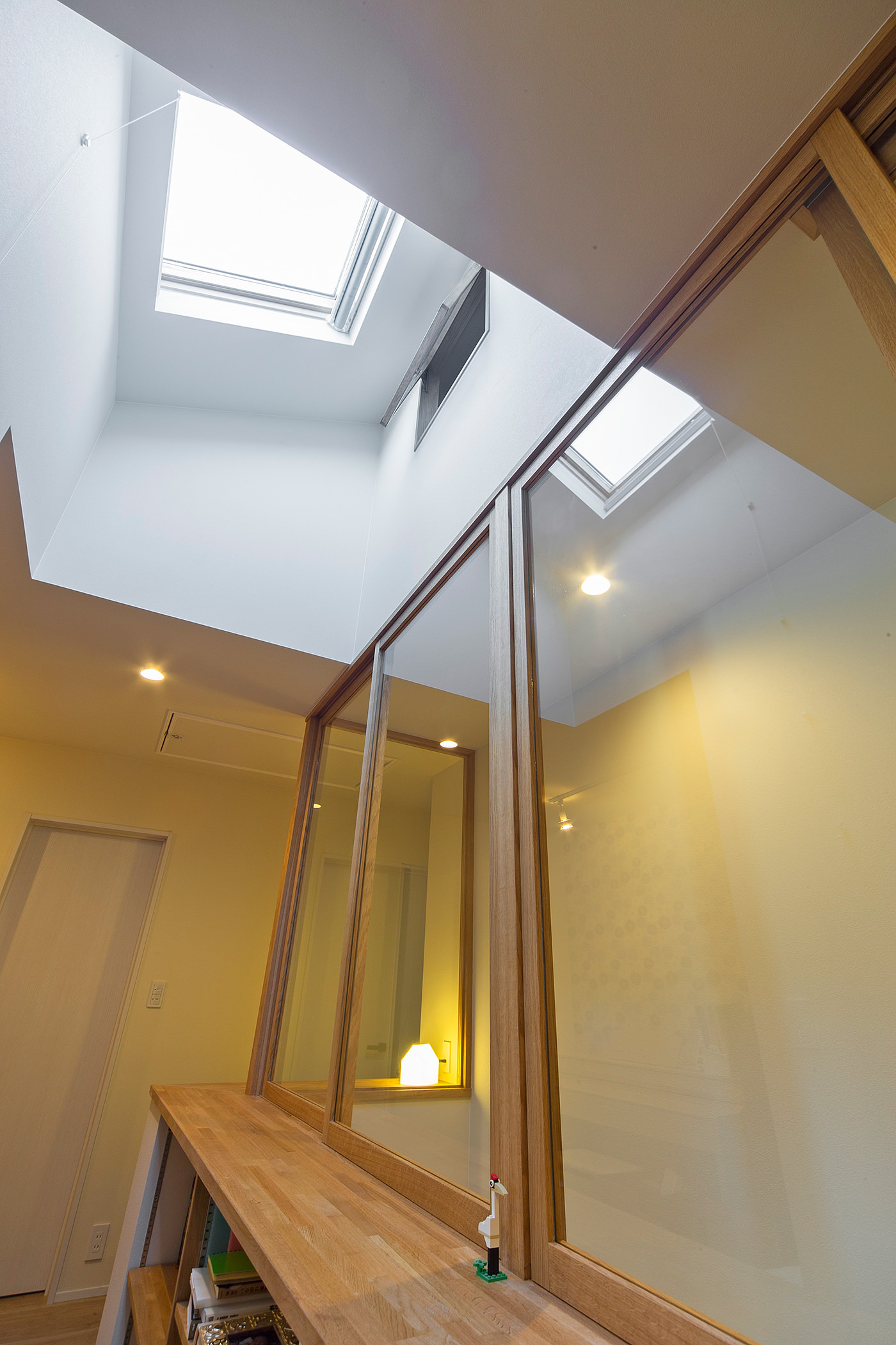 棚の上部はガラスの間仕切りを設け、光を通しながら1階からの暖気が逃げるのを防いでいる。もとからあった天窓を生かし、光がより広がる設計に