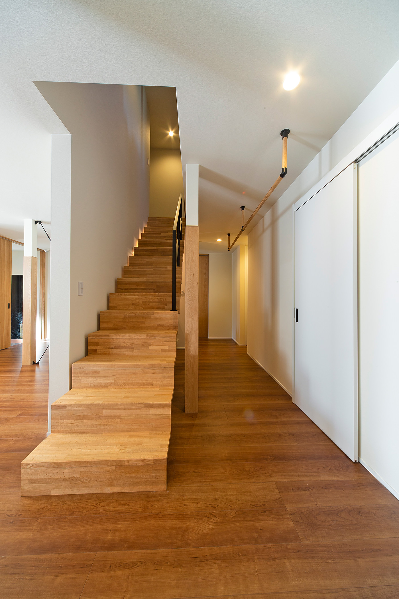 1階の廊下をなくしてLDKを広くし、階段の位置も変えて家族のコミュニケーションを密にするリビング階段に。